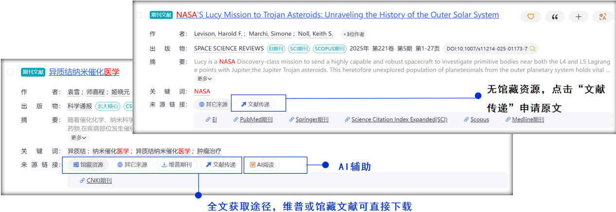 平台整合全球海量学术文献元数据,涵盖WOS、EI、Scopus、PubMed、JCR、北大核心、CSSCI、CSCD等重要收录,支持13种文献类型(期刊论文、图书、专利、法规等),平台支持IP自动登录、漫游访问、H5移动端等多种方式,方便用户在校内校外无缝使用。